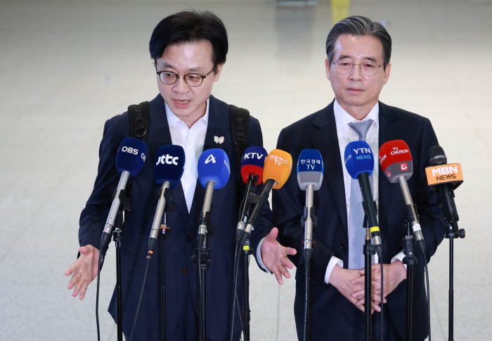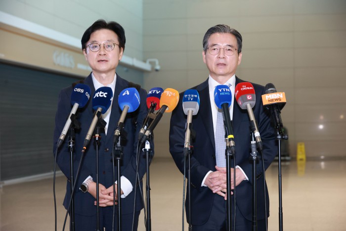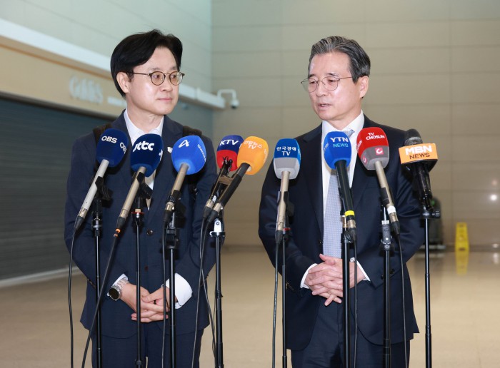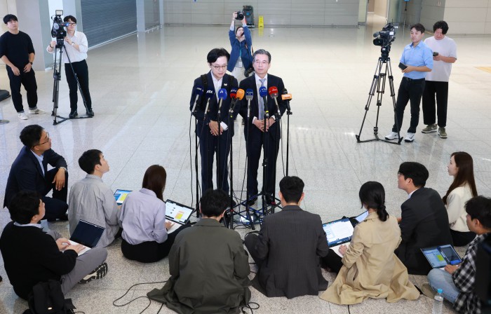 [영종도=뉴스핌] 김학선 기자 = 김용범 대통령실 정책실장(오른쪽)과 김정관 산업통상자원부 장관이 16일 한미 관세 협상 후속 협의를 위해 인천국제공항을 통해 미국으로 출국하며 취재진의 질문에 답하고 있다. 2025.10.16 yooksa@newspim.com