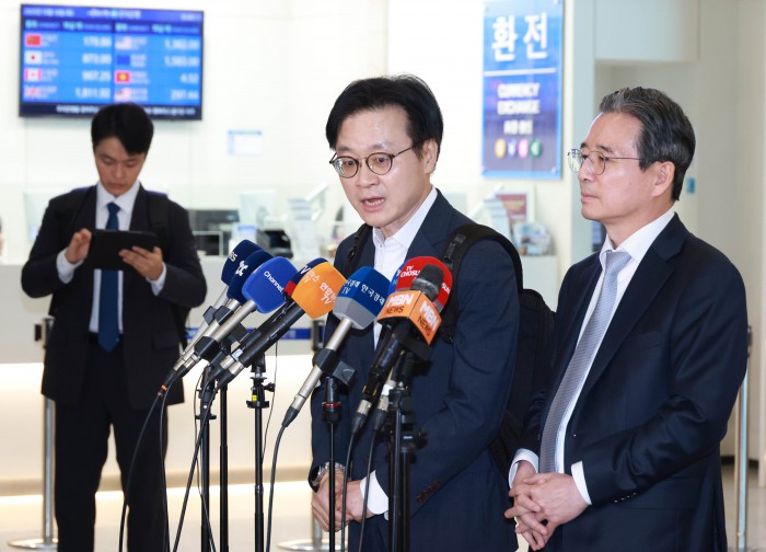 [영종도=뉴스핌] 김학선 기자 = 김정관 산업통상자원부 장관(왼쪽)이 16일 한미 관세 협상 후속 협의를 위해 인천국제공항을 통해 미국으로 출국하며 취재진의 질문에 답하고 있다. 오른쪽은 김용범 대통령실 정책실장. 2025.10.16 yooksa@newspim.com