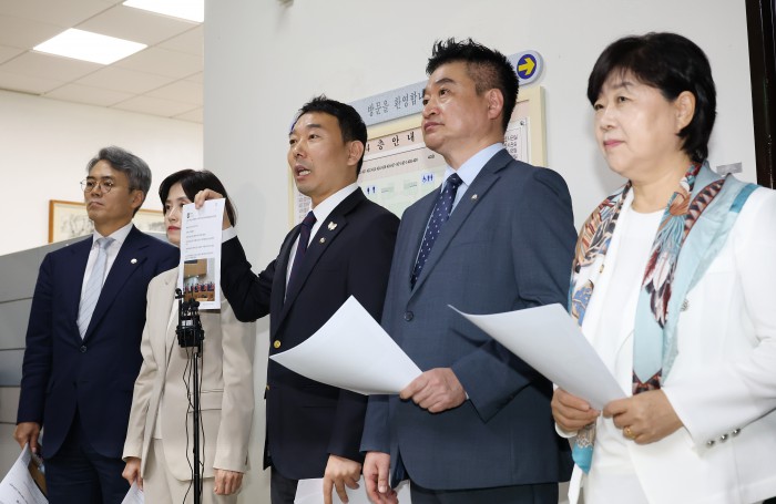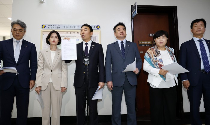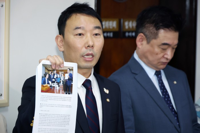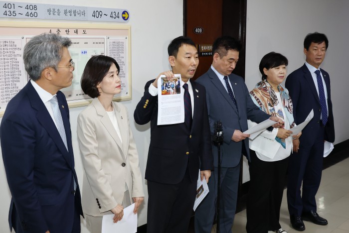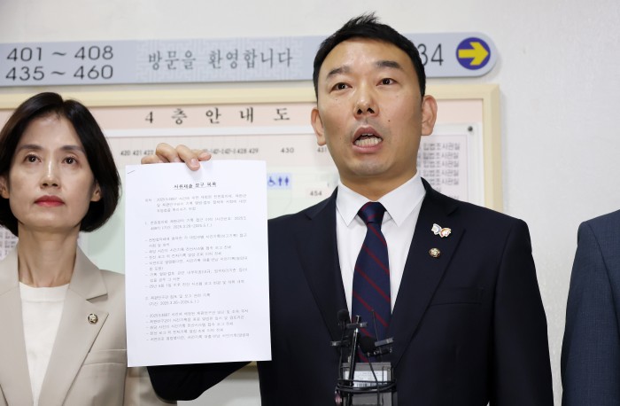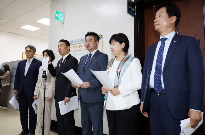 [서울=뉴스핌] 정일구 기자 = 김용민 국회 법제사법위원회 더불어민주당 간사를 비롯한 의원들이 16일 서울 여의도 국회 법제사법위원회에서 열린 감사원에 대한 국정감사가 중지된 뒤 전날 대법원 현장검증에 대한 국민의힘의 사실 왜곡 관련 기자회견을 하고 있다. 2025.10.16 mironj19@newspim.com