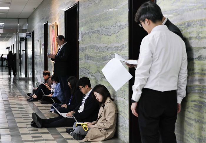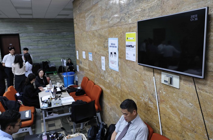 [서울=뉴스핌] 윤창빈 기자 = 16일 오후 서울 여의도 국회에서 열린 과학기술정보방송통신위원회 국정감사가 최민희 위원장이 취재진 퇴장을 선언해 비공개로 진행되자 취재진들이 회의장 밖에 앉아있다. 2025.10.16 pangbin@newspim.com