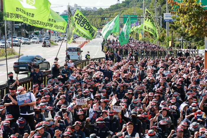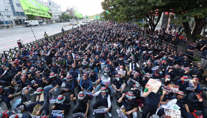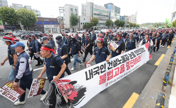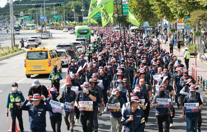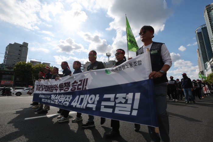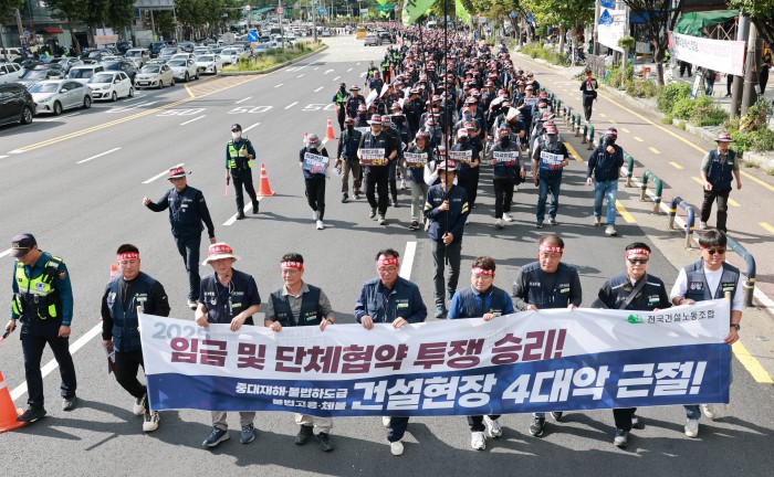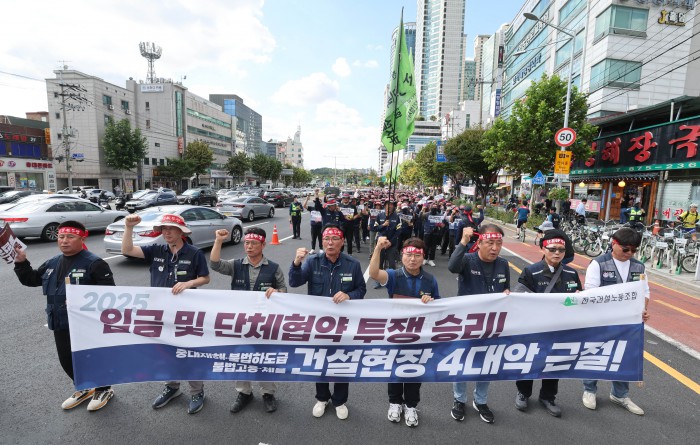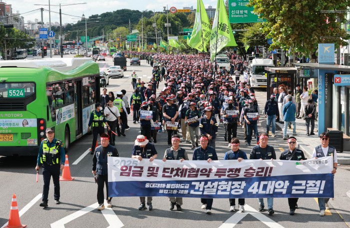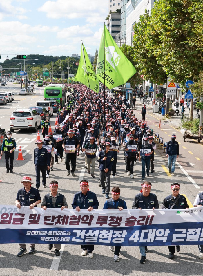 [서울=뉴스핌] 김학선 기자 = 16일 서울 관악구에서 열린 건설노조 전국동시다발 총파업 출정식에서 조합원들이 전문건설회관을 향해 행진하고 있다. 조합원들은 이날 출정식에서 '임금 및 단체협약 투쟁 승리, 중대재해, 불법하도급, 불법고용, 체불 건설현장 4대악 근절'을 촉구했다. 2025.10.16 yooksa@newspim.com
