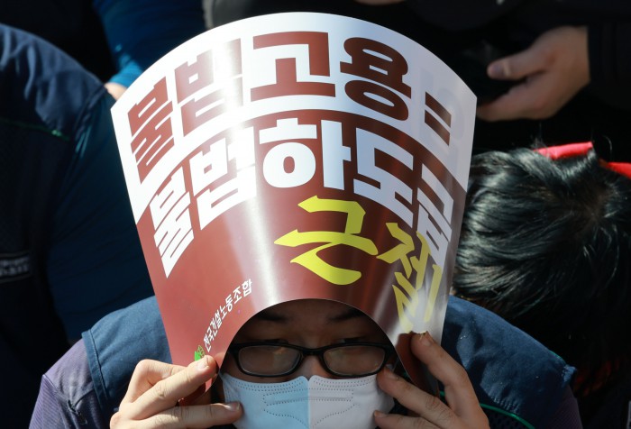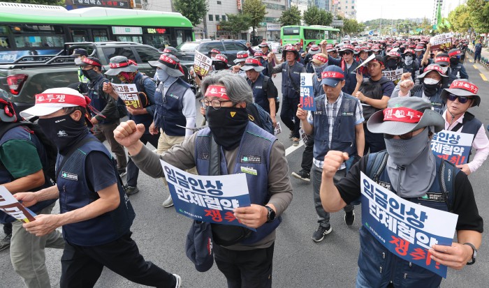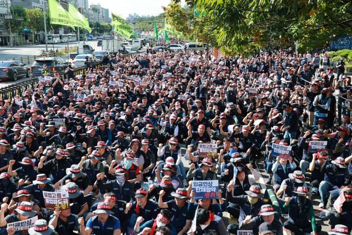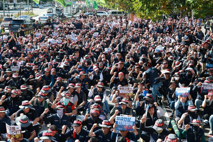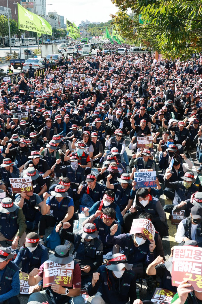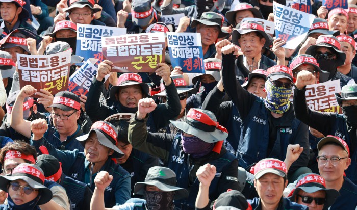 [서울=뉴스핌] 김학선 기자 = 16일 서울 관악구에서 열린 건설노조 전국동시다발 총파업 출정식에서 조합원들이 구호를 외치고 있다. 조합원들은 이날 출정식에서 '임금 및 단체협약 투쟁 승리, 중대재해, 불법하도급, 불법고용, 체불 건설현장 4대악 근절'을 촉구했다. 2025.10.16 yooksa@newspim.com