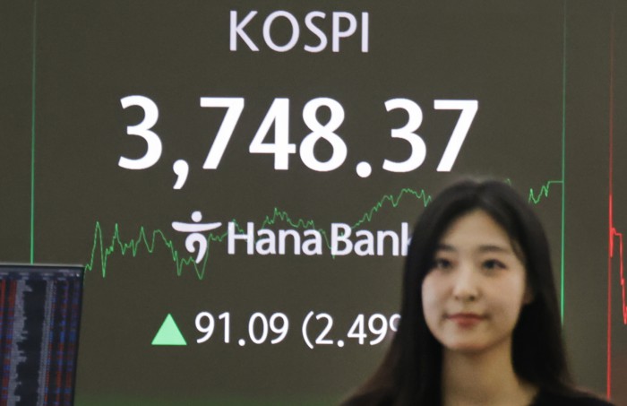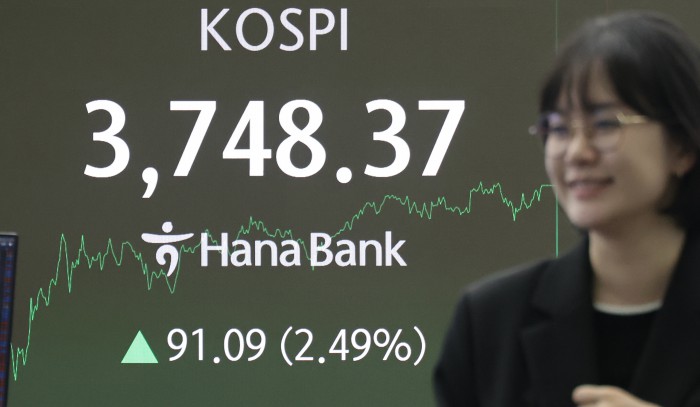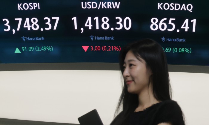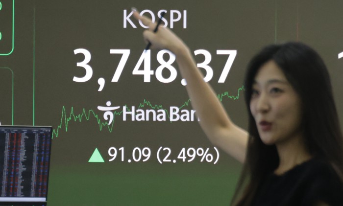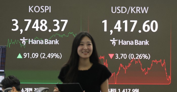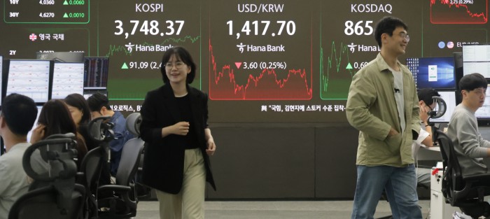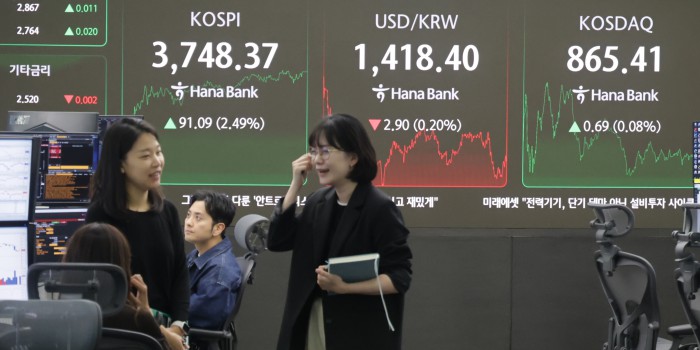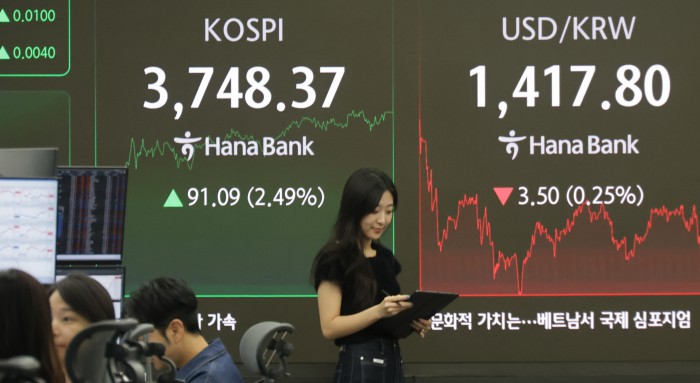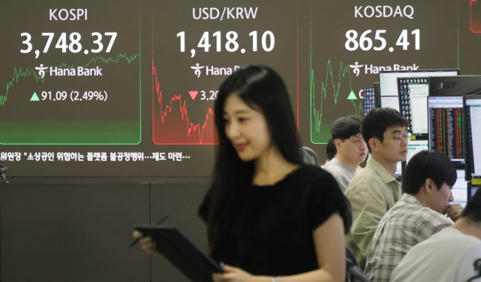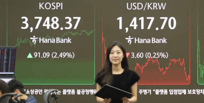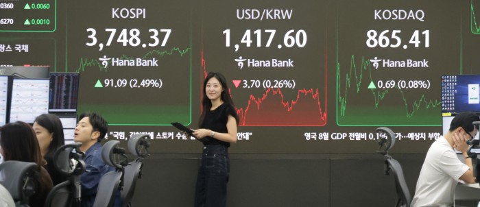 [서울=뉴스핌] 양윤모 기자 = 한미 무역협상의 최종 타결이 가시권에 들어온 가운데, 16일 오후 코스피가 전장 종가보다 91.09 포인트(2.49%) 상승하며 3748.37로, 코스닥은 0.69 포인트(0.08%) 상승한 865.41로 장을 마감한 가운데, 서울 중구 하나은행 딜링룸에서 직원들이 업무를 보고 있다.
