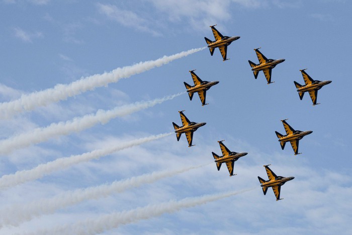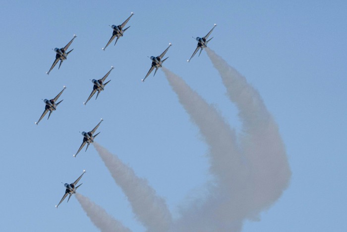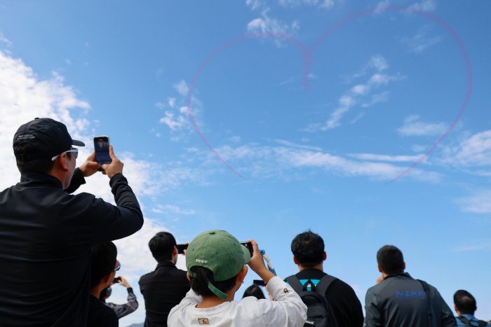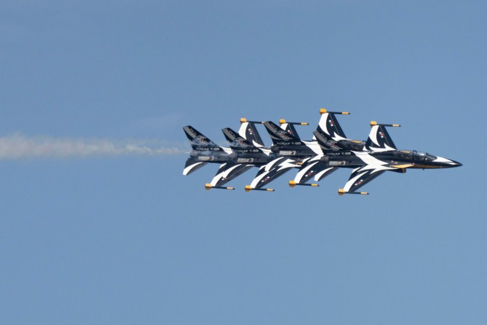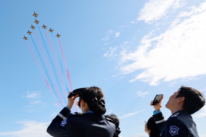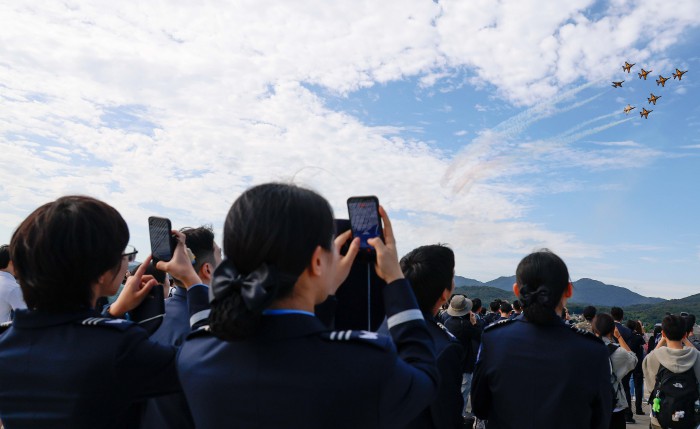 [성남=뉴스핌] 류기찬 기자 = 2025 서울 ADEX 개막일인 17일 오전 경기 성남시 서울공항에서 대한민국 공군 특수비행팀 블랙이글스가 비행을 하고 있다. 2025.10.17 ryuchan0925@newspim.com