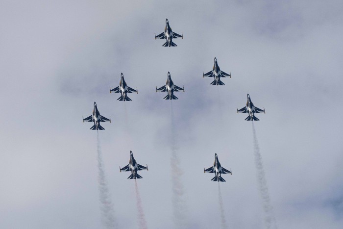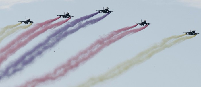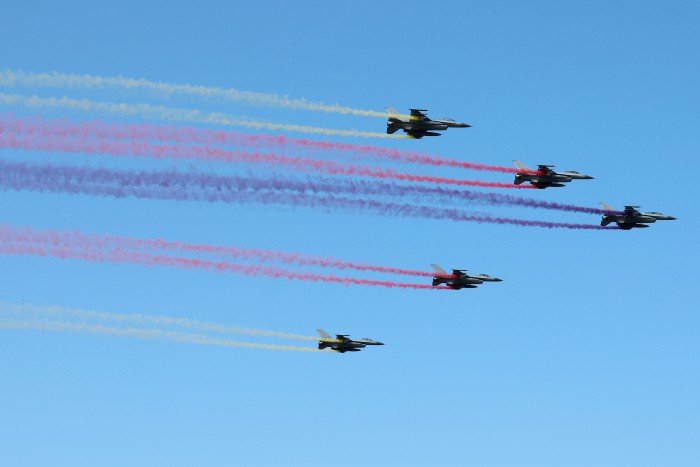 [성남=뉴스핌] 류기찬 기자 = 2025 서울 ADEX 개막일인 17일 오전 경기 성남시 서울공항에서 KF-16 편대가 축하비행을 하고 있다. 2025.10.17 ryuchan0925@newspim.com