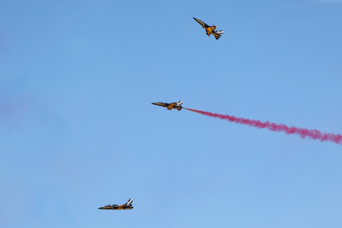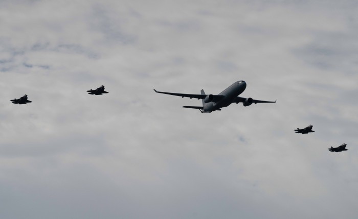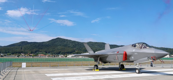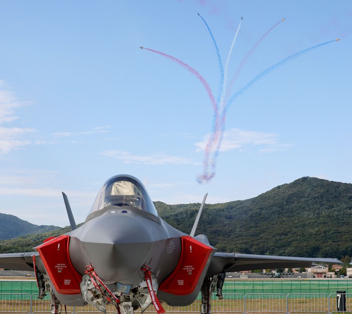 [성남=뉴스핌] 류기찬 기자 = 2025 서울 ADEX 개막일인 17일 오전 경기 성남시 서울공항에서 KC-330 공중급유기(가운데)와 F-35A 편대가 축하비행을 하고 있다. 2025.10.17 ryuchan0925@newspim.com