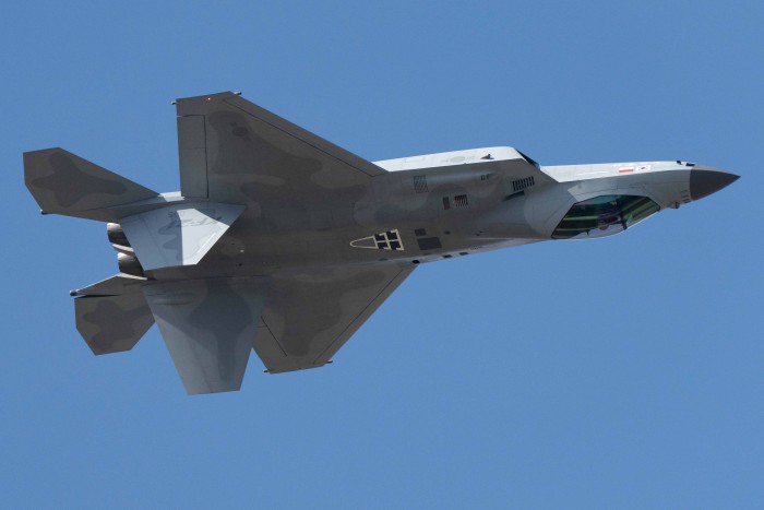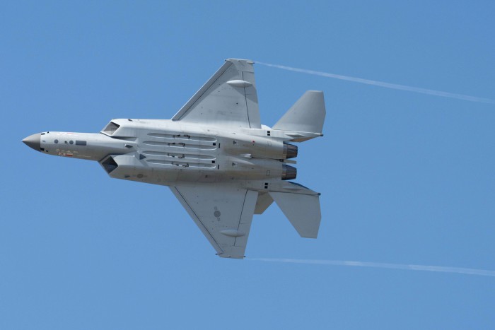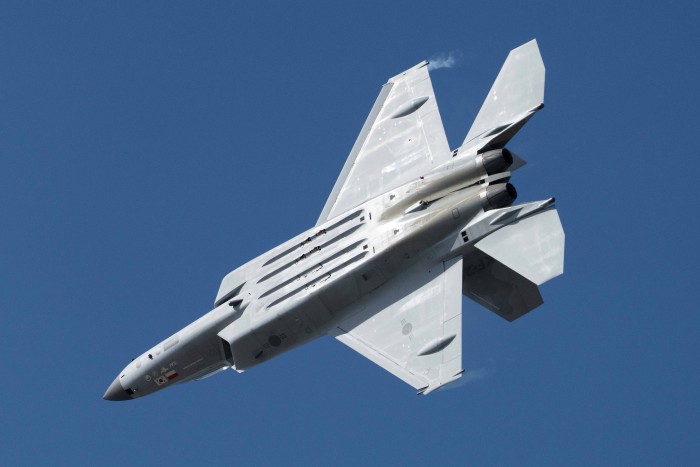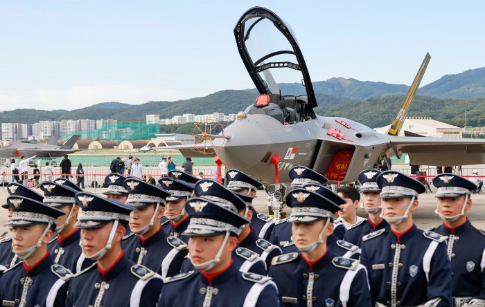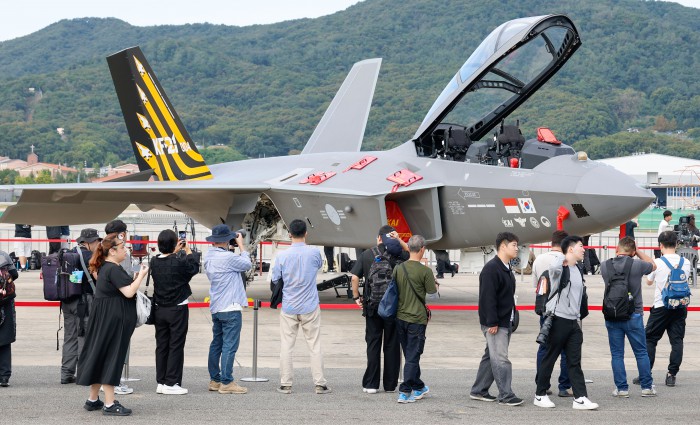 [성남=뉴스핌] 류기찬 기자 = 2025 서울 ADEX 개막일인 17일 오전 경기 성남시 서울공항에서 관람객들이 KF-21 보라매를 관람하고 있다. 2025.10.17 ryuchan0925@newspim.com