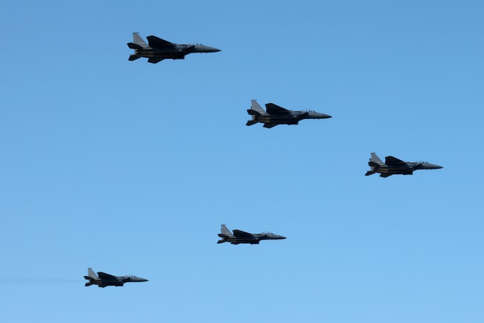[성남=뉴스핌] 류기찬 기자 = 2025 서울 ADEX 개막일인 17일 오전 경기 성남시 서울공항에서 F-15K 편대가 축하비행을 하고 있다. 2025.10.17 ryuchan0925@newspim.com