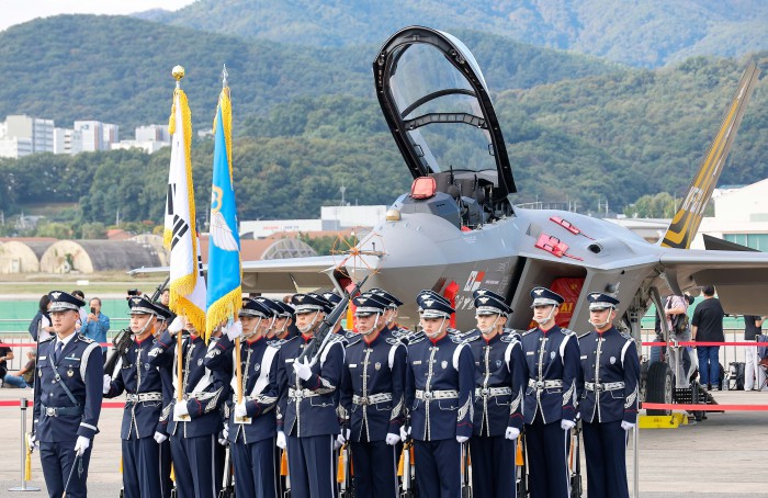 [성남=뉴스핌] 류기찬 기자 = 2025 서울 ADEX 개막일인 17일 오전 경기 성남시 서울공항에서 KF-21 보라매가 전시되어 있다. 2025.10.17 ryuchan0925@newspim.com