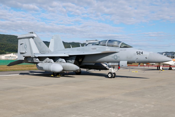 [성남=뉴스핌] 류기찬 기자 = 2025 서울 ADEX 개막일인 17일 오전 경기 성남시 서울공항에서 미 해군 EA-18G 그라울러가 전시되고 있다. 2025.10.17 ryuchan0925@newspim.com