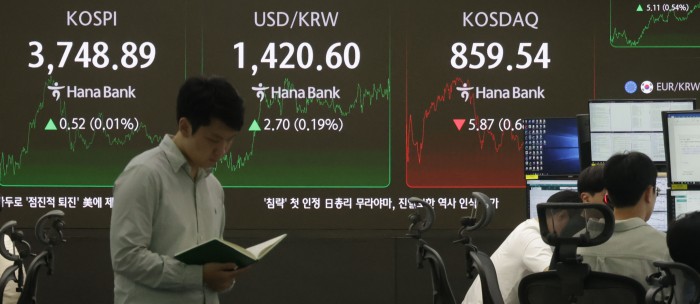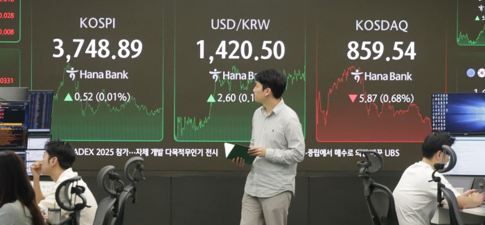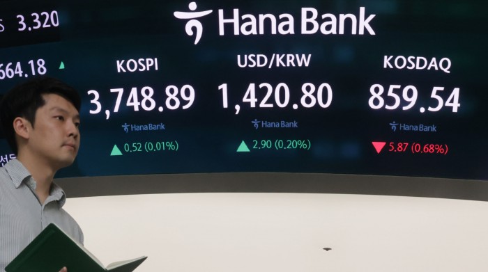 [서울=뉴스핌] 양윤모 기자 = 17일 오후 코스피가 전장 종가보다 0.52 포인트(0.01%) 상승하며 3748.89로, 코스닥은 5.87 포인트(0.68%) 하락한 859.54로 장을 마감한 가운데, 서울 중구 하나은행 딜링룸에서 직원들이 업무를 보고 있다.