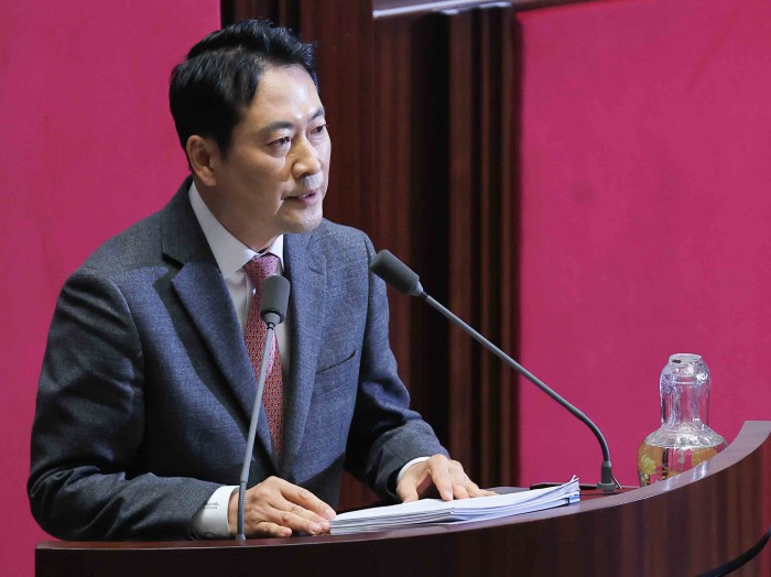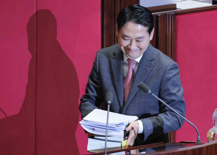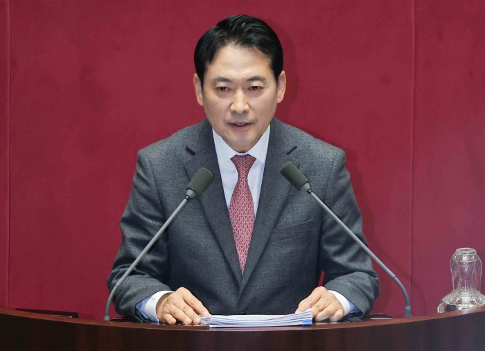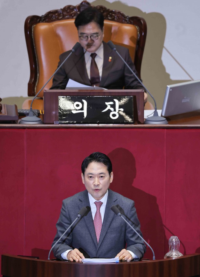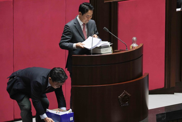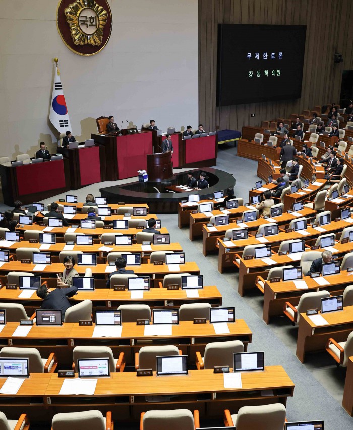 [서울=뉴스핌] 윤창빈 기자 = 장동혁 국민의힘 대표가 22일 서울 여의도 국회에서 열린 본회의에서 12·3 윤석열 비상계엄 등에 대한 전담재판부 설치 및 제보자 보호 등에 관한 특별법안(대안)에 대한 무제한 토론(필리버스터)을 하기 위해 단상에 오르고 있다. 2025.12.22 pangbin@newspim.com