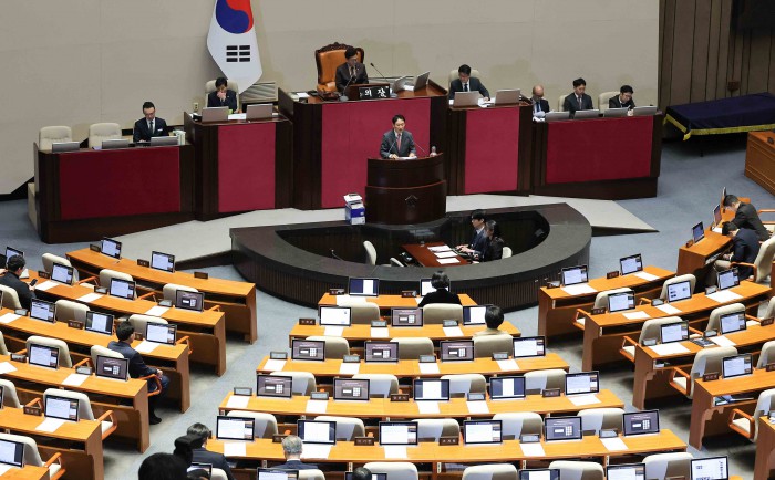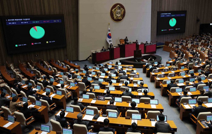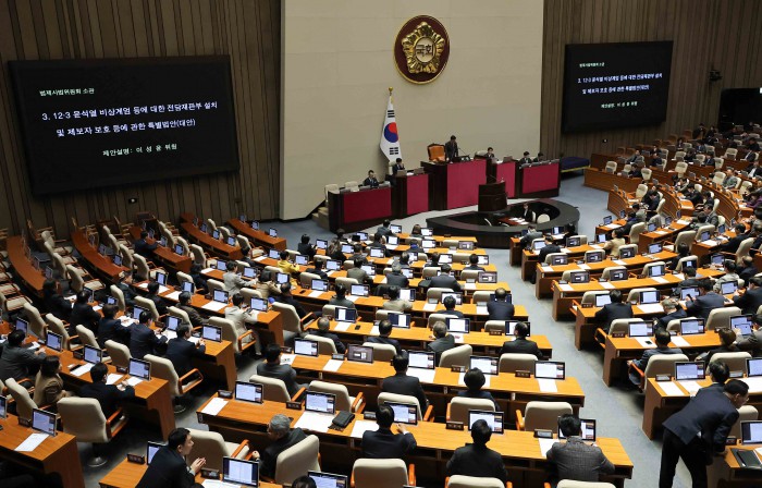 [서울=뉴스핌] 윤창빈 기자 = 22일 서울 여의도 국회에서 열린 본회의에서 12·3 윤석열 비상계엄 등에 대한 전담재판부 설치 및 제보자 보호 등에 관한 특별법안(대안)이 상정되고 있다. 2025.12.22 pangbin@newspim.com