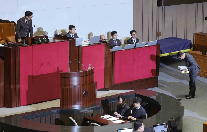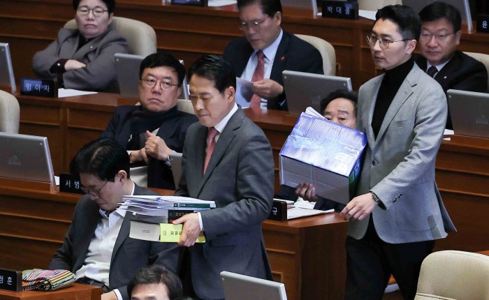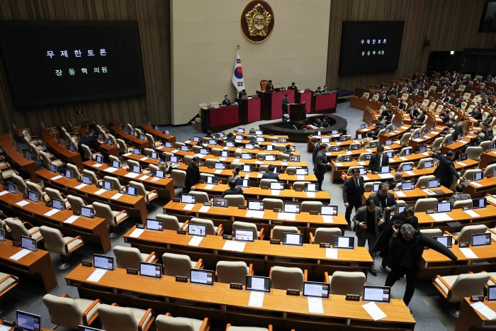 [서울=뉴스핌] 윤창빈 기자 = 장동혁 국민의힘 대표가 22일 서울 여의도 국회에서 열린 본회의에서 12·3 윤석열 비상계엄 등에 대한 전담재판부 설치 및 제보자 보호 등에 관한 특별법안(대안)에 대한 무제한 토론(필리버스터)을 시작하자 더불어민주당 의원들이 회의장을 나서고 있다. 2025.12.22 pangbin@newspim.com