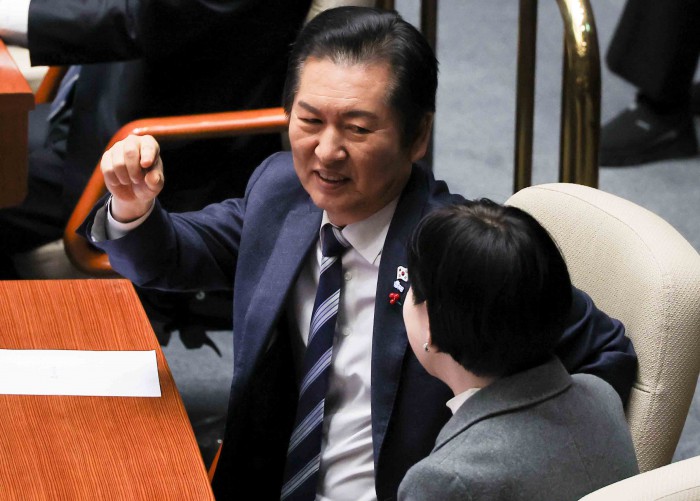 [서울=뉴스핌] 윤창빈 기자 = 정성호 법무부 장관이 22일 서울 여의도 국회에서 열린 본회의에서 서왕진 조국혁신당 원내대표와 대화하고 있다. 2025.12.22 pangbin@newspim.com