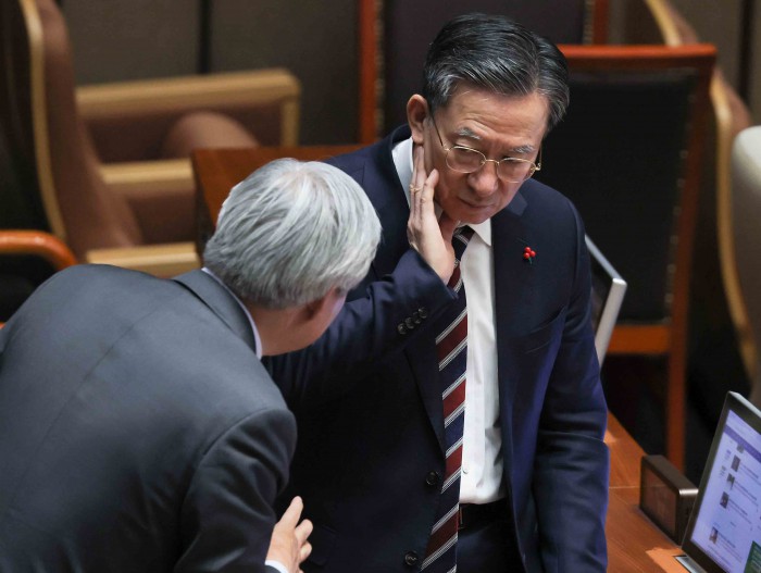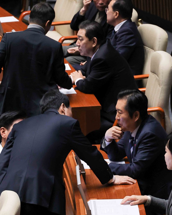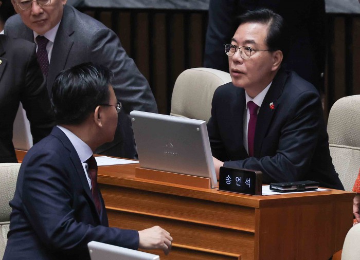 [서울=뉴스핌] 윤창빈 기자 = 정청래 더불어민주당 대표(아래), 김병기 원내대표가 22일 서울 여의도 국회에서 열린 본회의에서 각각 대화를 나누고 있다. 2025.12.22 pangbin@newspim.com