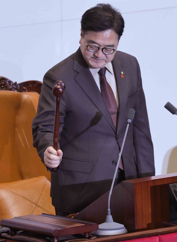 [서울=뉴스핌] 윤창빈 기자 = 우원식 국회의장이 22일 서울 여의도 국회에서 열린 본회의에서 의사봉을 두드리고 있다. 2025.12.22 pangbin@newspim.com
