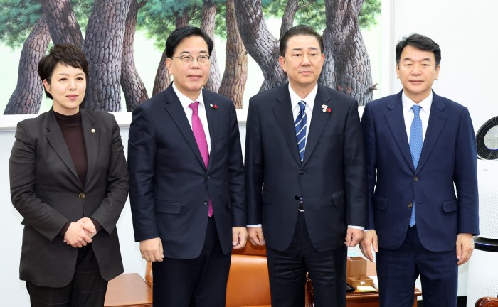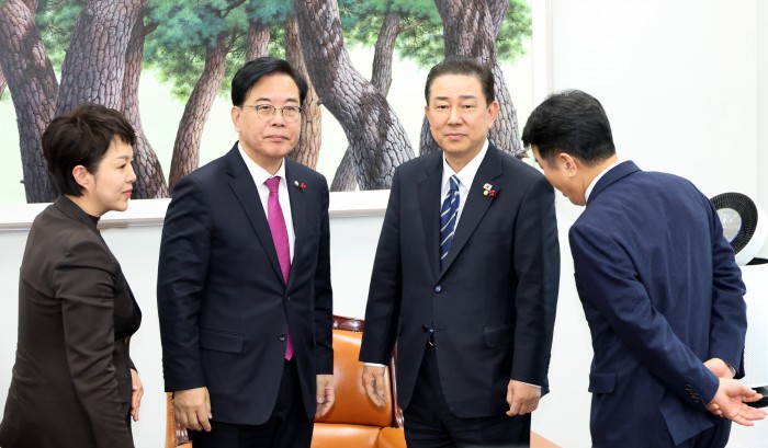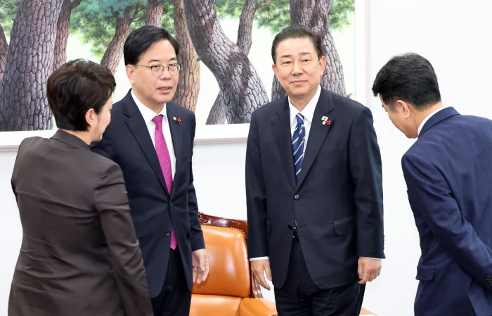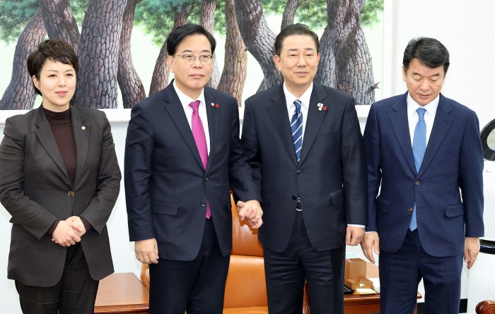 [서울=뉴스핌] 정일구 기자 = 김병기 더불어민주당 원내대표와 송언석 국민의힘 원내대표가 22일 오후 서울 여의도 국회에서 통일교 특검 논의를 위한 회동을 갖고 있다. 왼쪽부터 김은혜 국민의힘 원내정책수석부대표, 송 원내대표, 김 원내대표, 문진석 더불어민주당 원내운영수석부대표. 2025.12.22 mironj19@newspim.com