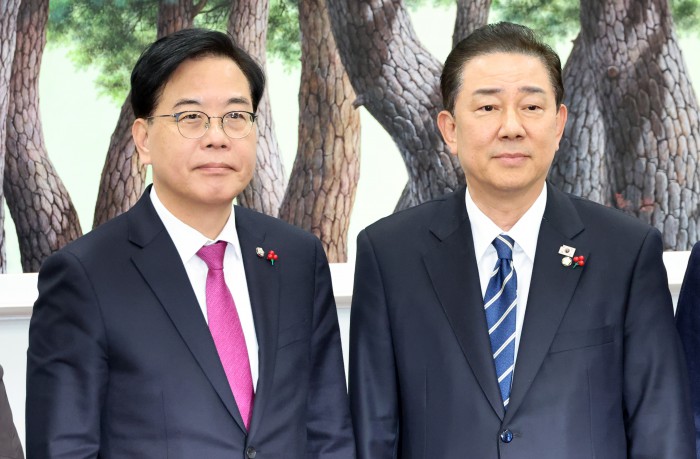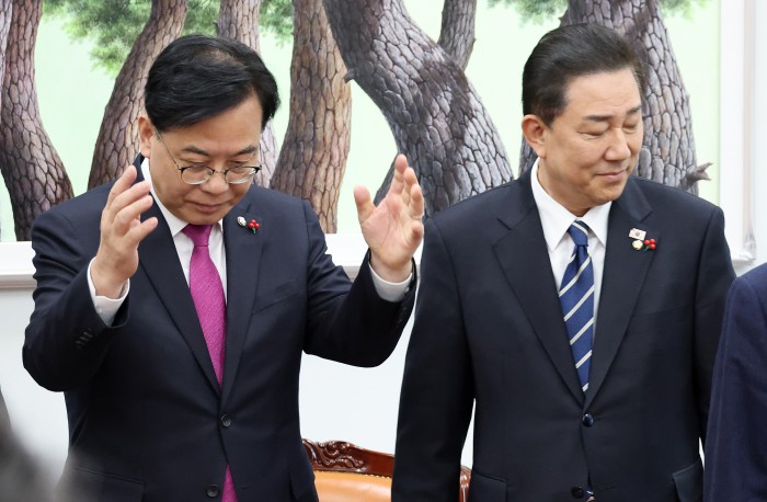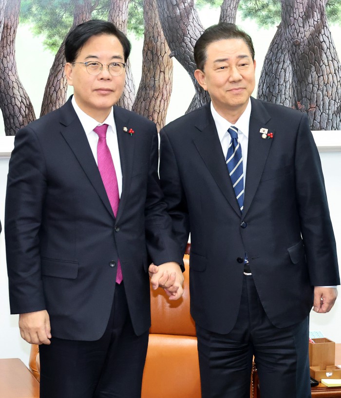 [서울=뉴스핌] 정일구 기자 = 김병기 더불어민주당 원내대표와 송언석 국민의힘 원내대표가 22일 오후 서울 여의도 국회에서 통일교 특검 논의를 위한 회동을 갖고 있다. 2025.12.22 mironj19@newspim.com