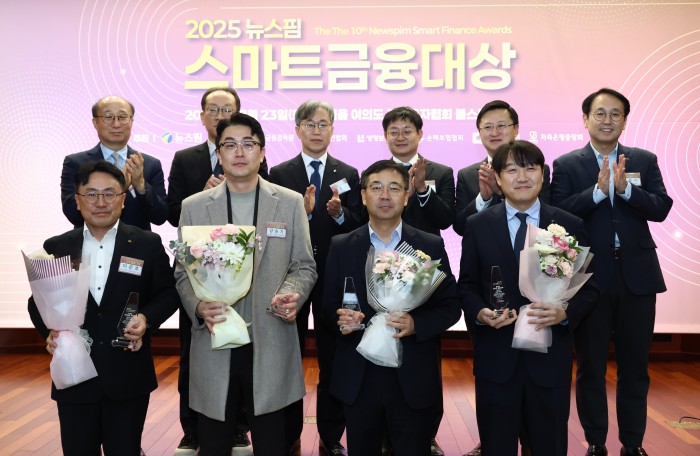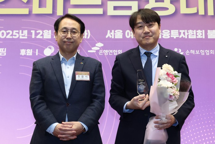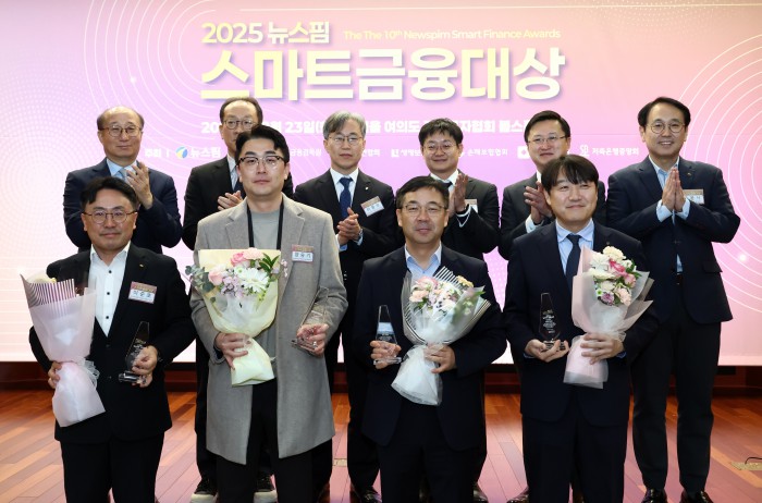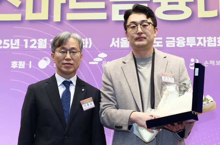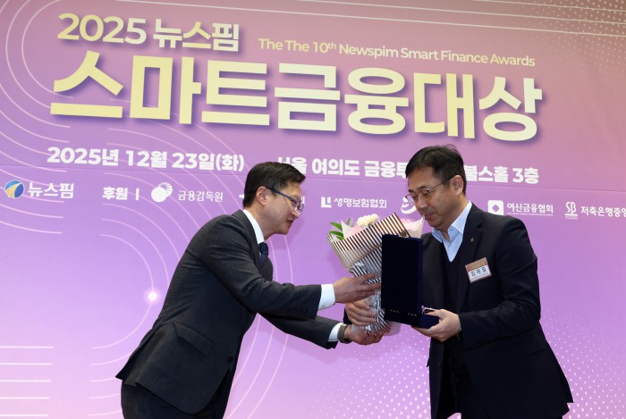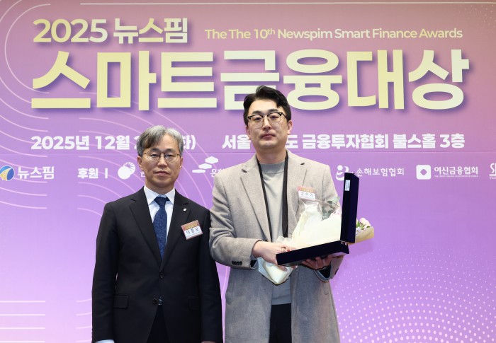 [서울=뉴스핌] 최지환 기자 = 이종오 금융감독원 부원장보가 23일 오전 서울 영등포구 금융투자협회에서 뉴스핌 주최로 열린 2025 뉴스핌 스마트금융대상에서 양승기 삼성화재 고객파트너쉽기획파트장에게 'AI 금융 리더' 부문 대상을 시상한 후 함께 기념촬영을 하고 있다. 2025.12.23 choipix16@newspim.com