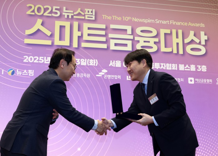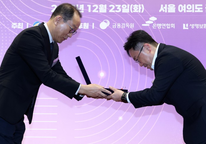 [서울=뉴스핌] 최지환 기자 = 김경민 전국은행연합회 본부장이 23일 오전 서울 영등포구 금융투자협회에서 뉴스핌 주최로 열린 2025 뉴스핌 스마트금융대상에서 이준호 KB국민은행 모바일사업본부 상무에게 AI 금융 플랫폼 리더상을 시상하고 있다. 2025.12.23 choipix16@newspim.com