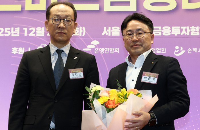 [서울=뉴스핌] 최지환 기자 = 김경민 전국은행연합회 본부장이 23일 오전 서울 영등포구 금융투자협회에서 뉴스핌 주최로 열린 2025 뉴스핌 스마트금융대상에서 이준호 KB국민은행 모바일사업본부 상무에게 AI 금융 플랫폼 리더상을 시상한 후 함께 기념촬영을 하고 있다. 2025.12.23 choipix16@newspim.com
