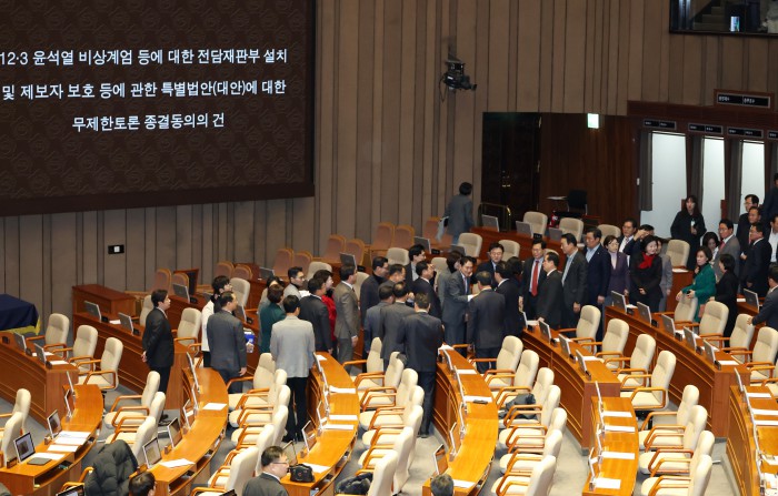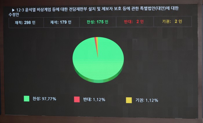 [서울=뉴스핌] 정일구 기자 = 23일 서울 여의도 국회에서 열린 본회의에서 12·3 윤석열 비상계엄 등에 대한 전담재판부 설치 및 제보자 보호 등에 관한 특별법안(대안)에 대한 수정안이 가결되고 있다. 2025.12.23 mironj19@newspim.com