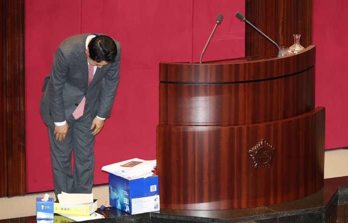 [서울=뉴스핌] 정일구 기자 = 장동혁 국민의힘 대표가 23일 서울 여의도 국회에서 열린 본회의에서 12·3 윤석열 비상계엄 등에 대한 전담재판부 설치 및 제보자 보호 등에 관한 특별법안(대안)에 대한 수정안에 대한 무제한 토론(필리버스터)을 마친 뒤 단상을 내려오고 있다. 2025.12.23 mironj19@newspim.com