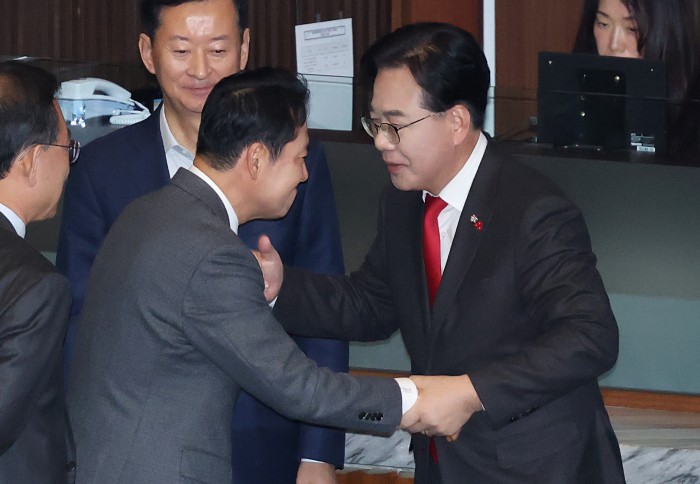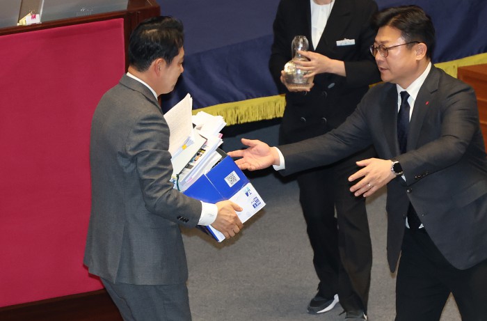 [서울=뉴스핌] 정일구 기자 = 장동혁 국민의힘 대표가 23일 서울 여의도 국회에서 열린 본회의에서 12·3 윤석열 비상계엄 등에 대한 전담재판부 설치 및 제보자 보호 등에 관한 특별법안(대안)에 대한 수정안에 대한 무제한 토론(필리버스터)을 마친 뒤 송언석 원내대표와 인사를 나누고 있다. 2025.12.23 mironj19@newspim.com