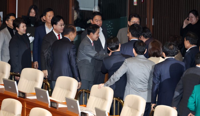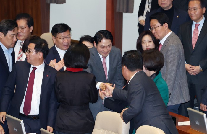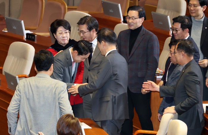 [서울=뉴스핌] 정일구 기자 = 장동혁 국민의힘 대표가 23일 서울 여의도 국회에서 열린 본회의에서 12·3 윤석열 비상계엄 등에 대한 전담재판부 설치 및 제보자 보호 등에 관한 특별법안(대안)에 대한 수정안에 대한 무제한 토론(필리버스터)을 마친 뒤 의원들과 인사를 나누고 있다. 2025.12.23 mironj19@newspim.com