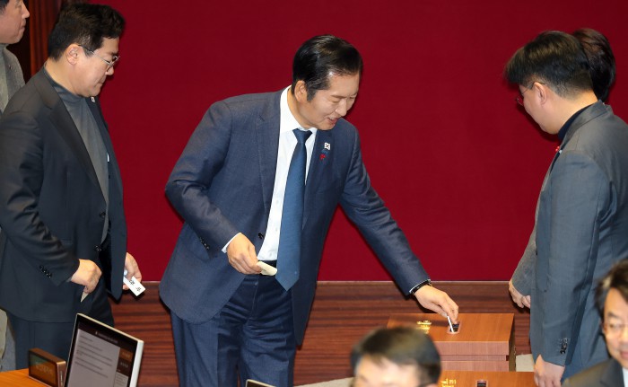 [서울=뉴스핌] 정일구 기자 = 정청래 더불어민주당 대표가 23일 서울 여의도 국회에서 열린 본회의에서 12·3 윤석열 비상계엄 등에 대한 전담재판부 설치 및 제보자 보호 등에 관한 특별법안(대안) 수정안에 대한 무제한 토론(필리버스터) 종결 동의의 건 투표를 하고 있다. 2025.12.23 mironj19@newspim.com