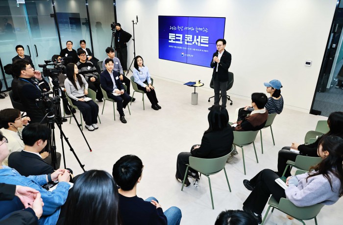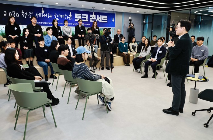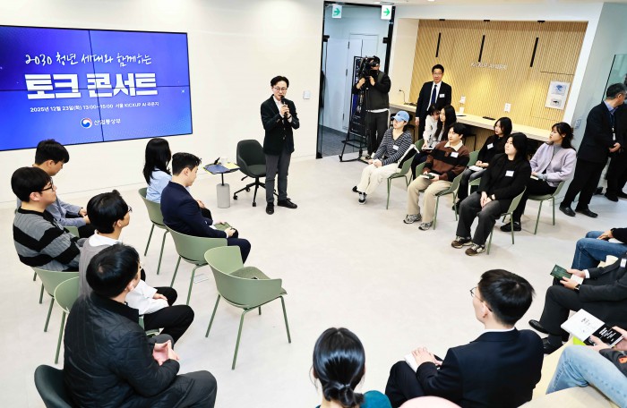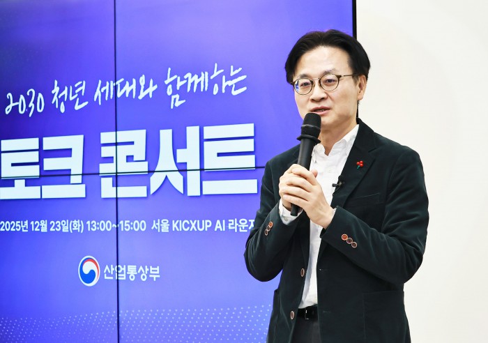 [서울=뉴스핌] 김정관 산업통상부 장관이 23일 서울 구로구 구로디지털단지 지타워 킥스업 AI라운지에서 열린 2030 청년세대 토크콘서트에서 인사말을 하고 있다. [사진=산업통상부] 2025.12.23 photo@newspim.com