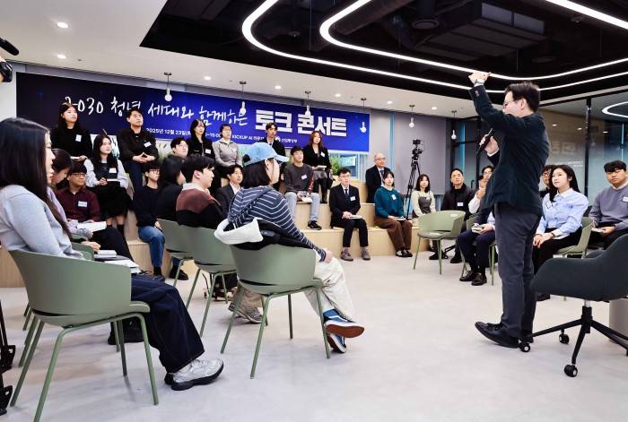 [서울=뉴스핌] 김정관 산업통상부 장관이 23일 서울 구로구 구로디지털단지 지타워 킥스업 AI라운지에서 열린 2030 청년세대 토크콘서트에서 참석자들과 기념촬영을 하고 있다. [사진=산업통상부] 2025.12.23 photo@newspim.com