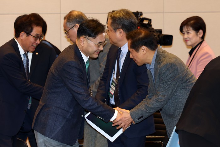 [서울=뉴스핌] 최지환 기자 = 차정인 국가교육위원회 위원장이 23일 오후 서울 영등포구 FKI타워 컨퍼런스센터에서 열린 국가교육위원회 운영 보고회에 입장하며 참석자들과 인사하고 있다. 2025.12.23 choipix16@newspim.com