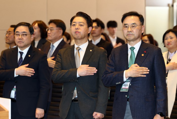 [서울=뉴스핌] 최지환 기자 = 차정인 국가교육위원회 위원장(오른쪽 부터), 김영호 국회 교육위원회 위원장이 23일 오후 서울 영등포구 FKI타워 컨퍼런스센터에서 열린 국가교육위원회 운영 보고회에서 국민의례를 하고 있다. 2025.12.23 choipix16@newspim.com
