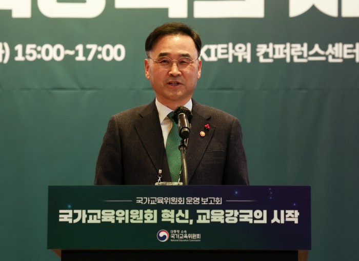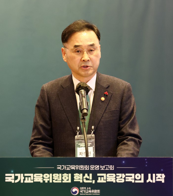 [서울=뉴스핌] 최지환 기자 = 차정인 국가교육위원회 위원장이 23일 오후 서울 영등포구 FKI타워 컨퍼런스센터에서 열린 국가교육위원회 운영 보고회에서 '국가교육위원회의 혁신과 미래'를 주제로 기조발언을 하고 있다. 2025.12.23 choipix16@newspim.com