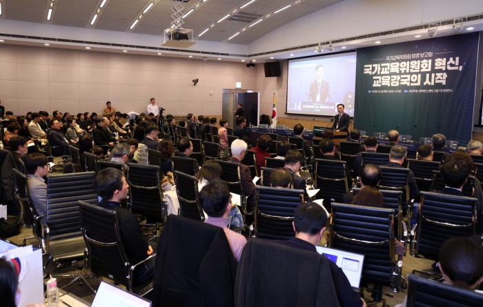 [서울=뉴스핌] 최지환 기자 = 차정인 국가교육위원회 위원장(왼쪽 다섯번째)이 23일 오후 서울 영등포구 FKI타워 컨퍼런스센터에서 열린 국가교육위원회 운영 보고회에서 참석자들과 기념촬영을 하고 있다. 2025.12.23 choipix16@newspim.com