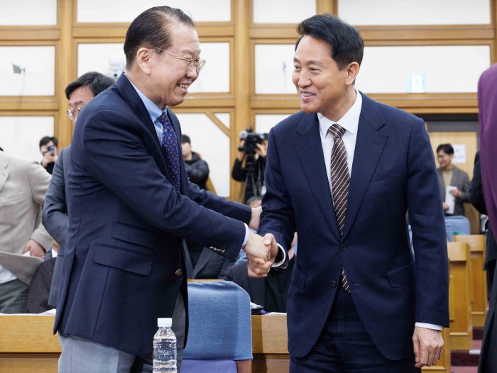 [서울=뉴스핌] 윤창빈 기자 = 권영세 국민의힘 의원, 오세훈 서울시장이 6일 오후 서울 여의도 국회 의원회관에서 열린 용산국제업무지구 '글로벌 허브'인가 '거대 베드타운'인가?' 정책 토론회에서 악수를 하고 있다. 2026.03.06 pangbin@newspim.com