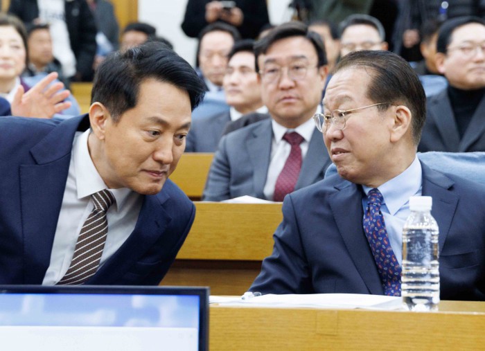 [서울=뉴스핌] 윤창빈 기자 = 권영세 국민의힘 의원, 오세훈 서울시장이 6일 오후 서울 여의도 국회 의원회관에서 열린 용산국제업무지구 '글로벌 허브'인가 '거대 베드타운'인가?' 정책 토론회에서 대화를 하고 있다. 2026.03.06 pangbin@newspim.com