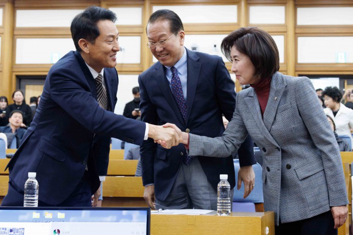 [서울=뉴스핌] 윤창빈 기자 = 나경원 국민의힘 의원, 오세훈 서울시장이 6일 오후 서울 여의도 국회 의원회관에서 열린 용산국제업무지구 '글로벌 허브'인가 '거대 베드타운'인가?' 정책 토론회에서 악수를 하고 있다. 2026.03.06 pangbin@newspim.com