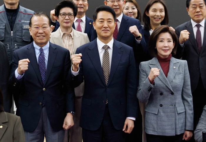 [서울=뉴스핌] 윤창빈 기자 = 권영세 국민의힘 의원, 나경원 의원, 오세훈 서울시장 등 참석자들이 6일 오후 서울 여의도 국회 의원회관에서 열린 용산국제업무지구 '글로벌 허브'인가 '거대 베드타운'인가?' 정책 토론회에서 기념촬영을 하고 있다. 2026.03.06 pangbin@newspim.com