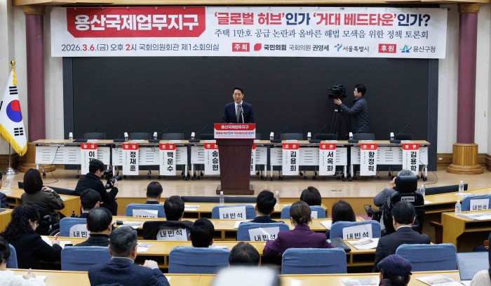 [서울=뉴스핌] 윤창빈 기자 = 권영세 국민의힘이 6일 오후 서울 여의도 국회 의원회관에서 열린 용산국제업무지구 '글로벌 허브'인가 '거대 베드타운'인가?' 정책 토론회에서 개회사를 하고 있다. 2026.03.06 pangbin@newspim.com