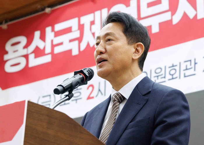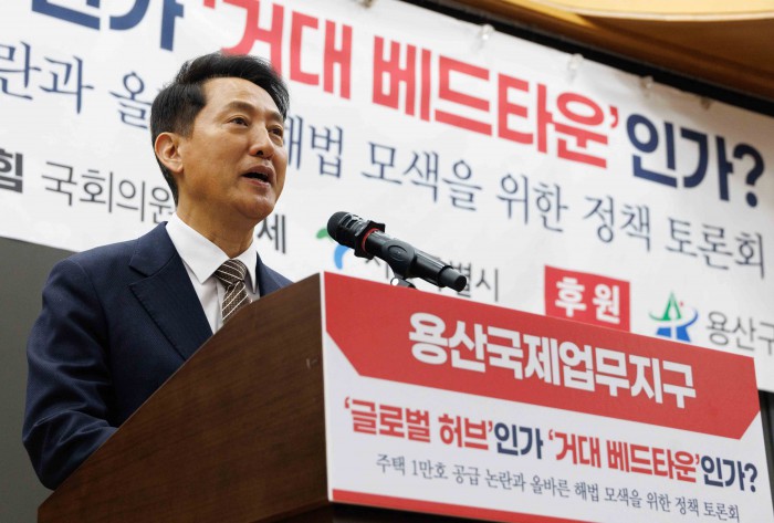 [서울=뉴스핌] 윤창빈 기자 = 오세훈 서울시장이 6일 오후 서울 여의도 국회 의원회관에서 열린 용산국제업무지구 '글로벌 허브'인가 '거대 베드타운'인가?' 정책 토론회에서 축사를 하고 있다. 2026.03.06 pangbin@newspim.com