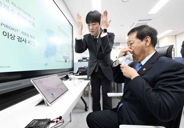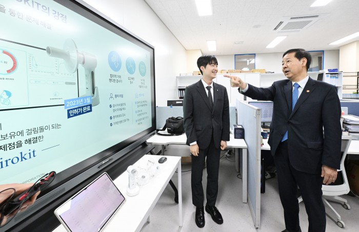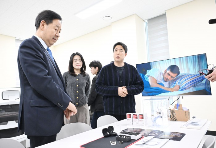 [서울=뉴스핌]구윤철 부총리 겸 재정경제부 장관이 6일 청년 재도전 창업 관련 현장방문으로 대전스타트업파크를 방문,창업자로부터 자사 제품 설명을 들으며 시연을 하고 있다.[사진=재정경제부] 2026.03.06 photo@newspim.com