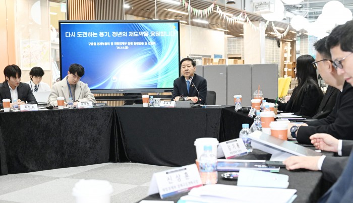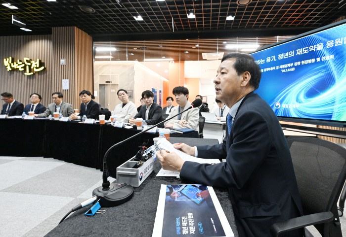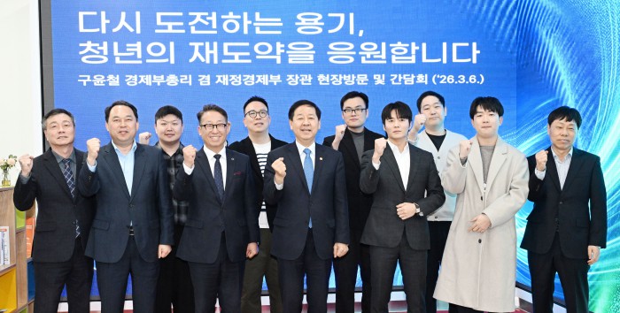 [서울=뉴스핌]구윤철 부총리 겸 재정경제부 장관이 6일 청년 재도전 창업 관련 현장방문으로 대전스타트업파크를 방문,관계기관, 전문가 및 창업자들과 간담회를 주재하고 있다.[사진=재정경제부] 2026.03.06 photo@newspim.com